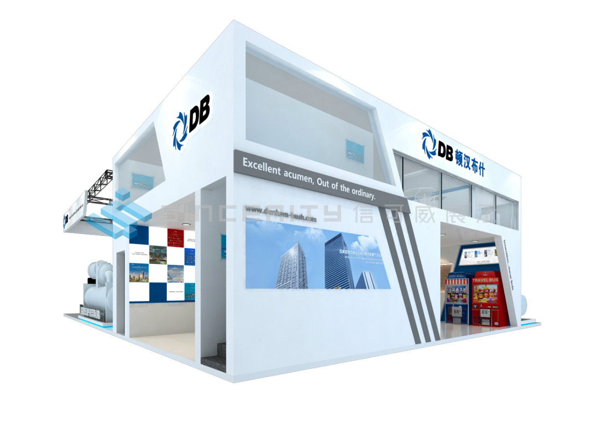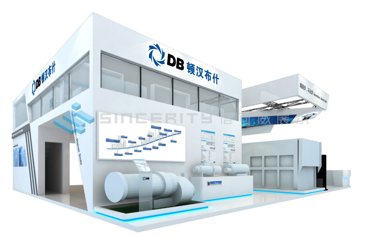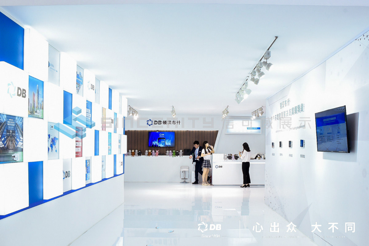 DB頓漢布什展臺設計以白為主色,藍色為輔色,展臺中央采用高科技折屏,著重突出DB品牌和產品的展示,契合DB全球品牌戰略的輸出,將情懷與科技融為一體。