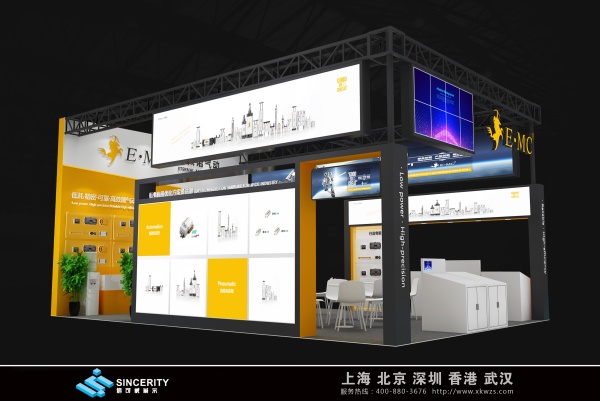 億太諾展會設計以白色和黃色為主色調,營造出明亮、專業的氛圍,展會的頂部和正面都有顯眼的品牌標識 “E?MC 億太諾氣動”,并配有標語 “行業高端氣動元件制造商”,突出了品牌的定位和理念。