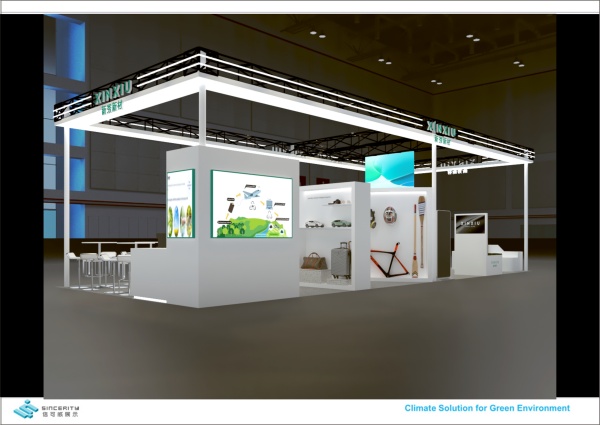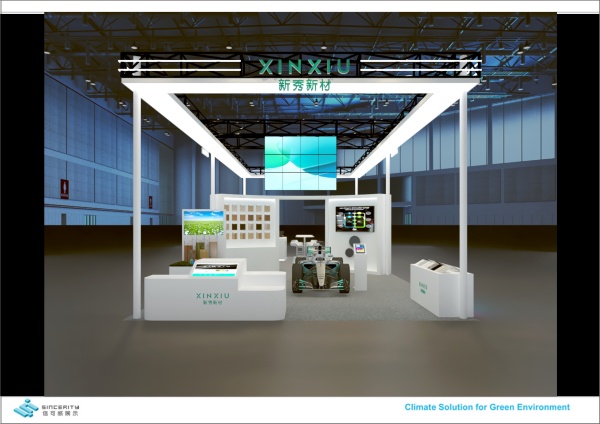深圳信可威作為新秀新材展會主承包商,信可威設計團隊借助企業的產品性質與行業特色以格調白為主色,以新秀綠、高級灰為輔色點綴,部分融入竹藤等生態木紋打造生態與科技相融合的新材料產品展示空間,營造出具有國際化、生態與科技感、復古&未來感并存的空間氛圍。