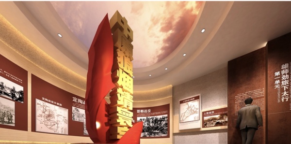 原建筑序廳空間為6900mm寬、10000mm進深, 擁有良好的縱深感,為此,我們設計孫中山鄧世昌、張弼士以圓雕的形象迎面走來,背后跟隨諸位膠東革命志士、政軍人物、文藝名人、實業楷模奮勇向前,追求民族的獨立和解放。觀眾可穿行其中,感受與這些名人同行的信念,兩側藝術肌理墻以開放的形態寓意開拓、拼搏精神的延續與傳播。