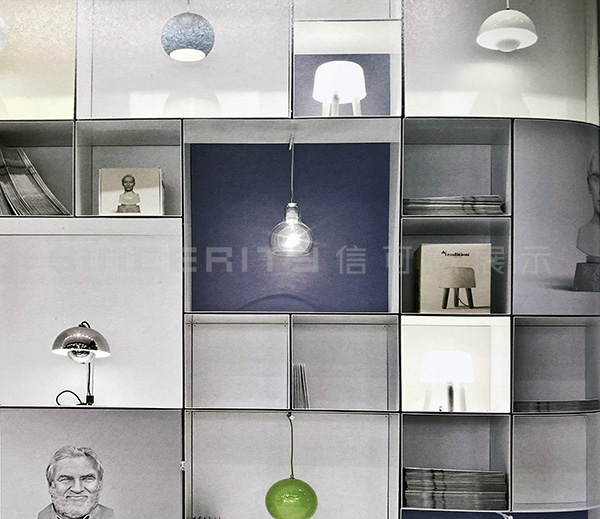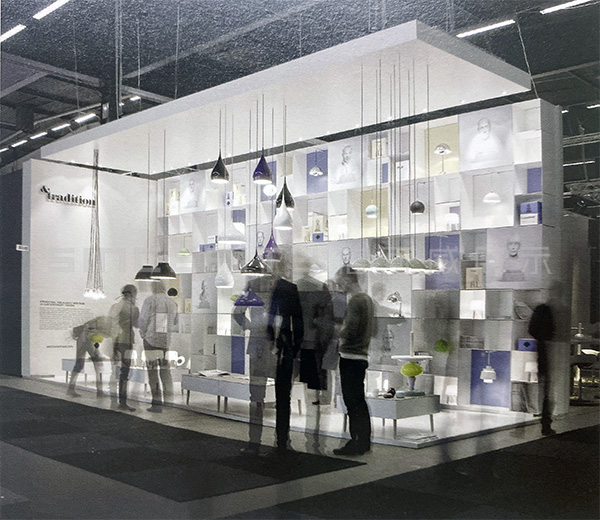 本項目是傳統公司在斯德哥爾摩家具展上的丹麥&tradition的燈具展臺設計。相比較而言,此展廳長而窄,很明顯只能在垂直方向上做文章。眾多格子頗有韻律地堆砌在一起,顯得俏皮而嚴肅,這正符合品牌的定位。展廳前后的顏色與&傳統的商標一致,公司設計師的大理石半身像被印成圖片掛在前面。展品與多維度的貨架完美地結合在一起,給人一種比例扭曲的感覺。形態各異的吊燈自天花板垂下,一起構成一襲透明的窗簾。