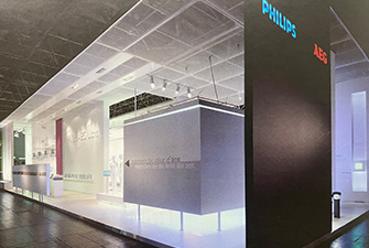 在國際零售業(yè)展覽會(huì)(EuroShop)上,菲利普通用電力公司(Philips AEG)展場(chǎng)設(shè)計(jì)理念的主旨是“多一點(diǎn)光”。依據(jù)不同的燈光設(shè)置,展示產(chǎn)品被分成幾組陳列。例如,在超級(jí)市場(chǎng)的主題區(qū)內(nèi),參觀者成了超市場(chǎng)景的一部分,其中那些外形相似的蘋果則成了超市的焦點(diǎn)之物。