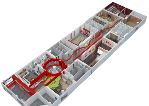 進門序廳形象標識和主題文字,設計紅船造型寓意著共產黨人揚起紅船風帆,賡續堅定理想,百折不奮斗爭精神。通過點睛的亞克力立體紅船、營造出入室第一視覺氛圍。增強深刻文化精神。